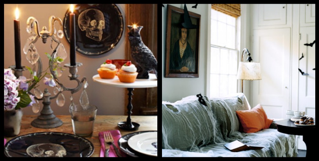 Once upon a time I was only into Halloween decorating for my kids until I realized, with the help of these pictures, that Halloween decorations do not have to be garish. They can actually be quite elegant and beautiful. You would be surprised at how the accessories you already own look with some stretched cheesecloth (webs) over them or how an ordinary bowl looks filled with glittery skeleton bones. Orange does not work in my home, my Halloween color scheme consists of black, white, silver, lime green and violet. I'm so happy with my decorations right now that I'm not sure I'm going to want to take them down. I'd love to see some of yours. Email them to me and I'll post them!